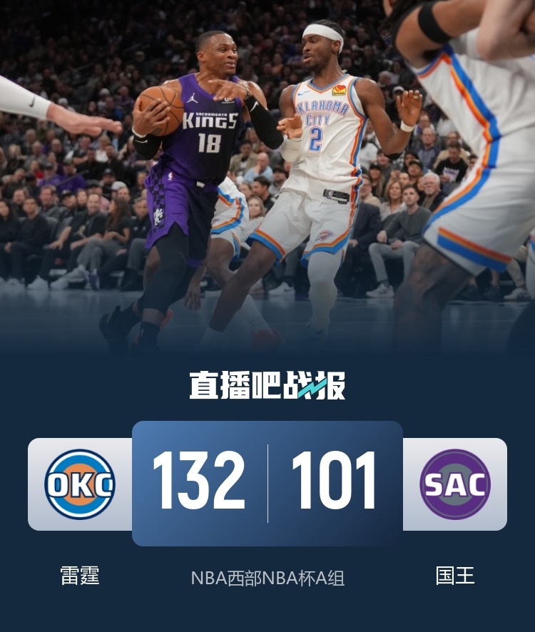首节上来,威少很快进入状态,单节三分4中3砍下11分,雷霆则是众人发力,两队陷入拉锯战,交替领先。次节哈滕发威,在内线抛投予取予求,单节7投全中,帮助球队单节砍下40分并建立优势,半场结束雷霆70-56领先。易边再战,亚历山大手感回暖,单节砍下15分,哈滕也是维持手感,雷霆稳稳掌握场上形势。末节回来,雷霆很快领先到20分以上,随后继续发力,分差来到30分,比赛失去悬念,最终雷霆132-101大胜国王。