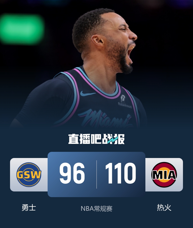 比赛开始,勇士全员不在状态,热火多点开花轰出23-9开局,随后勇士开始追分,但热火首节还领先9分,次节双方展开拉锯战,热火突然断电,勇士连续反击轰出17-4攻击波一度追平,阿德巴约2+1止血,半场热火还领先4分。下半场,双方展开拉锯战,热火始终保持微弱领先,但勇士再轰9-0终于反超比分,波斯特连续三分砍下8分,热火连续杀伤止血,三节勇士反超2分,末节热火9-3反超回来,随后鲍威尔连续突破砍下7分助队领先到双位数,随后热火牢牢掌握住10分左右领先,最终热火110-96击退勇士。
