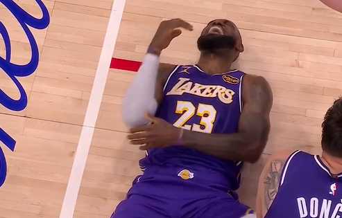 比赛第四节,詹姆斯反击快下欲扣篮,被贾巴里一把拉下&摔到手肘,表情非常痛苦。