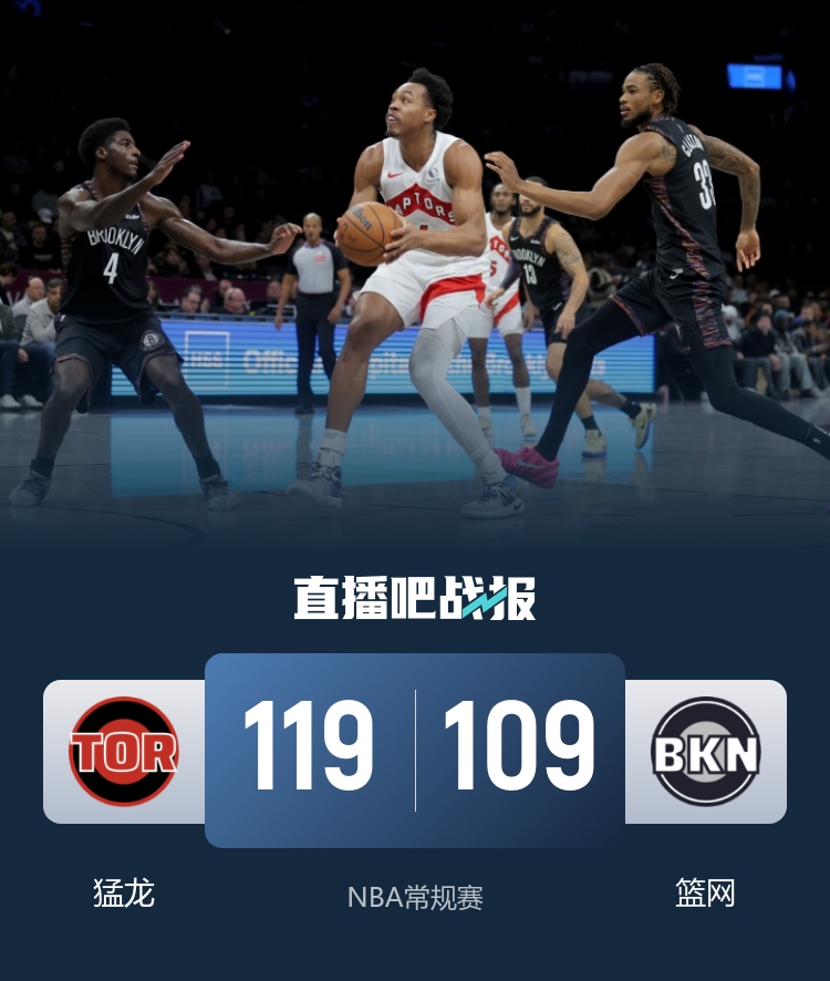 猛龙(6-5):英格拉姆25分5板4助、奎克利24分8板5助2断、巴恩斯15分11板5助、巴雷特13分4板6助、珀尔特尔12分10板2助2帽、博伊尔斯9分4板1助、迪克6分3板2助、谢德6分1板5助、沃尔特6分1板、巴特尔3分3板1助